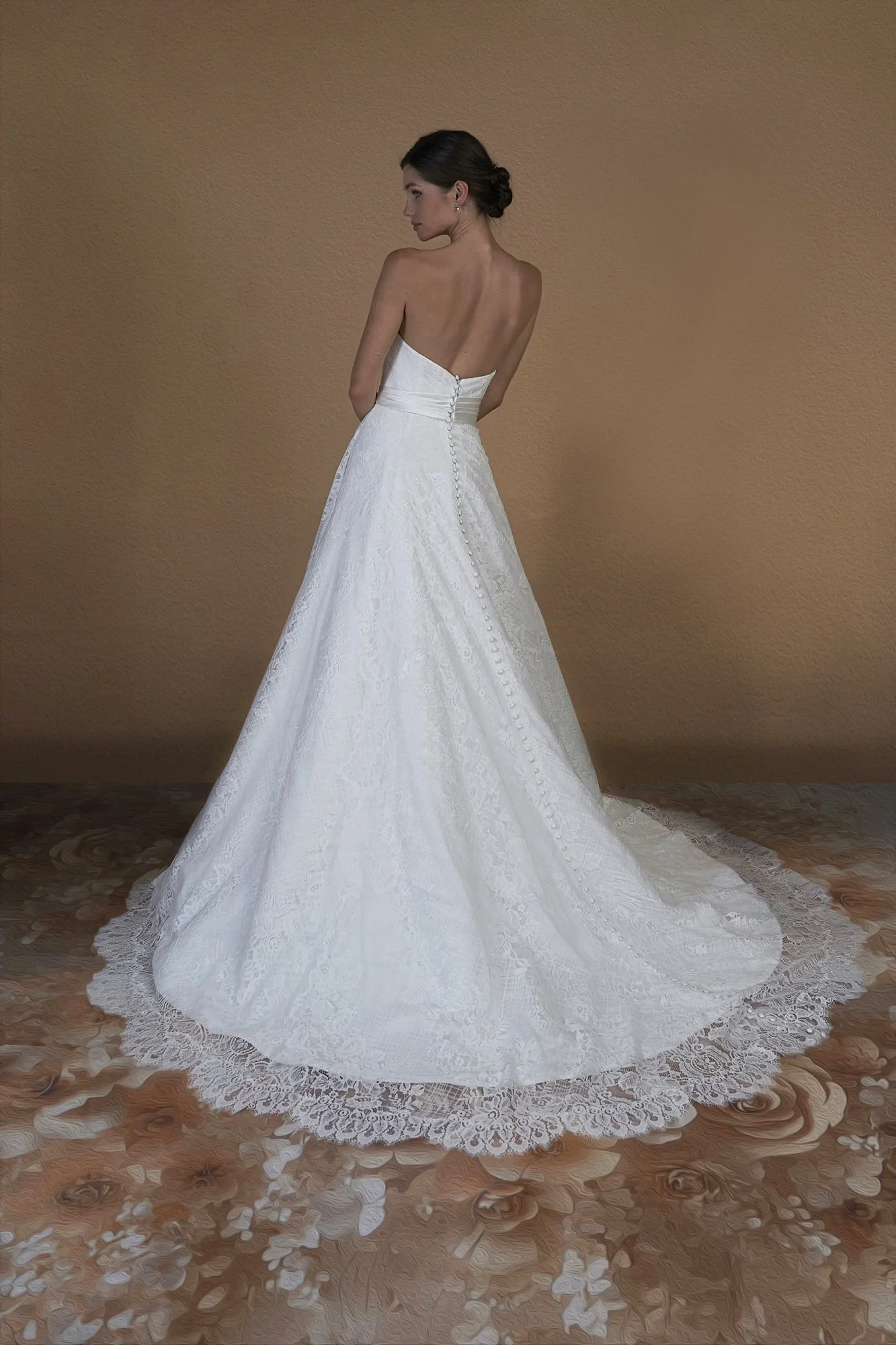 Strapless sweetheart natural waist Chantilly lace A-line gown with asymmetrical Ivory Soft Satin belt, pockets, and buttons to end of scalloped lace hem.