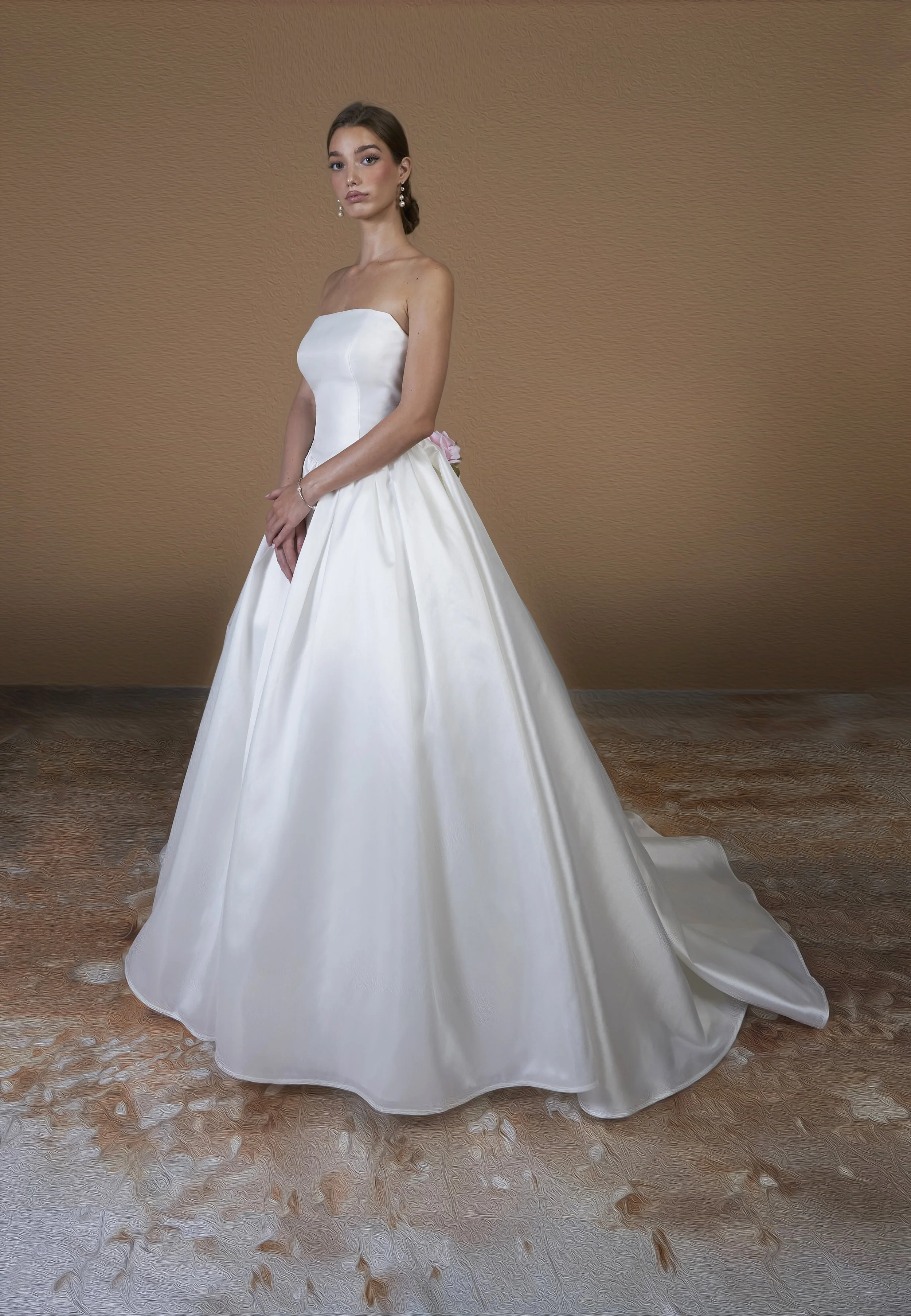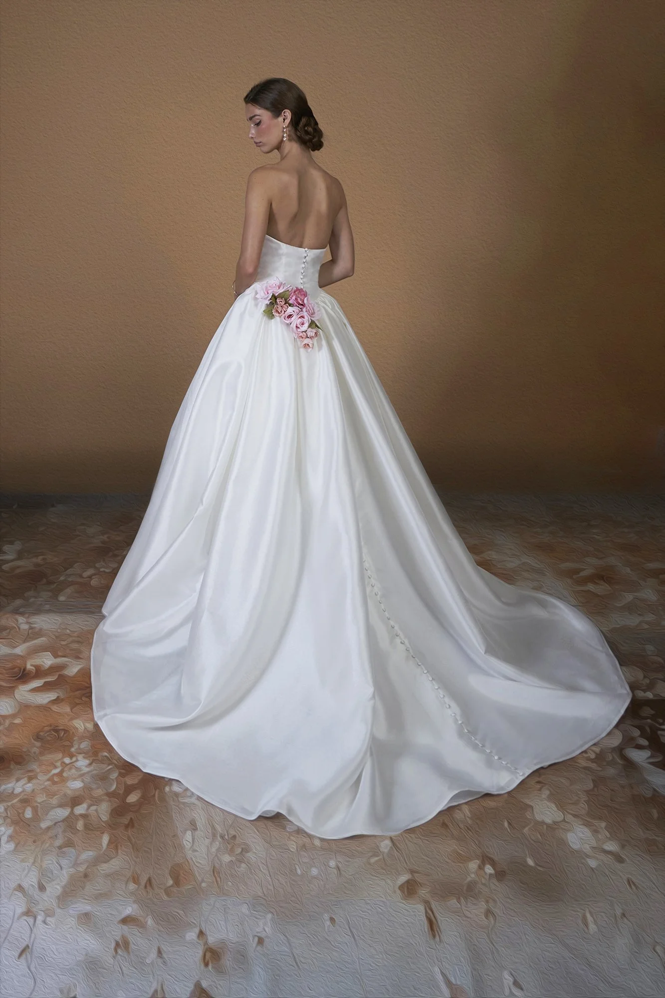 Strapless, straight across neckline, Basque waist Glazed Shantung ballgown, pockets, cathedral train, Back floral corsage and buttons to hem.
