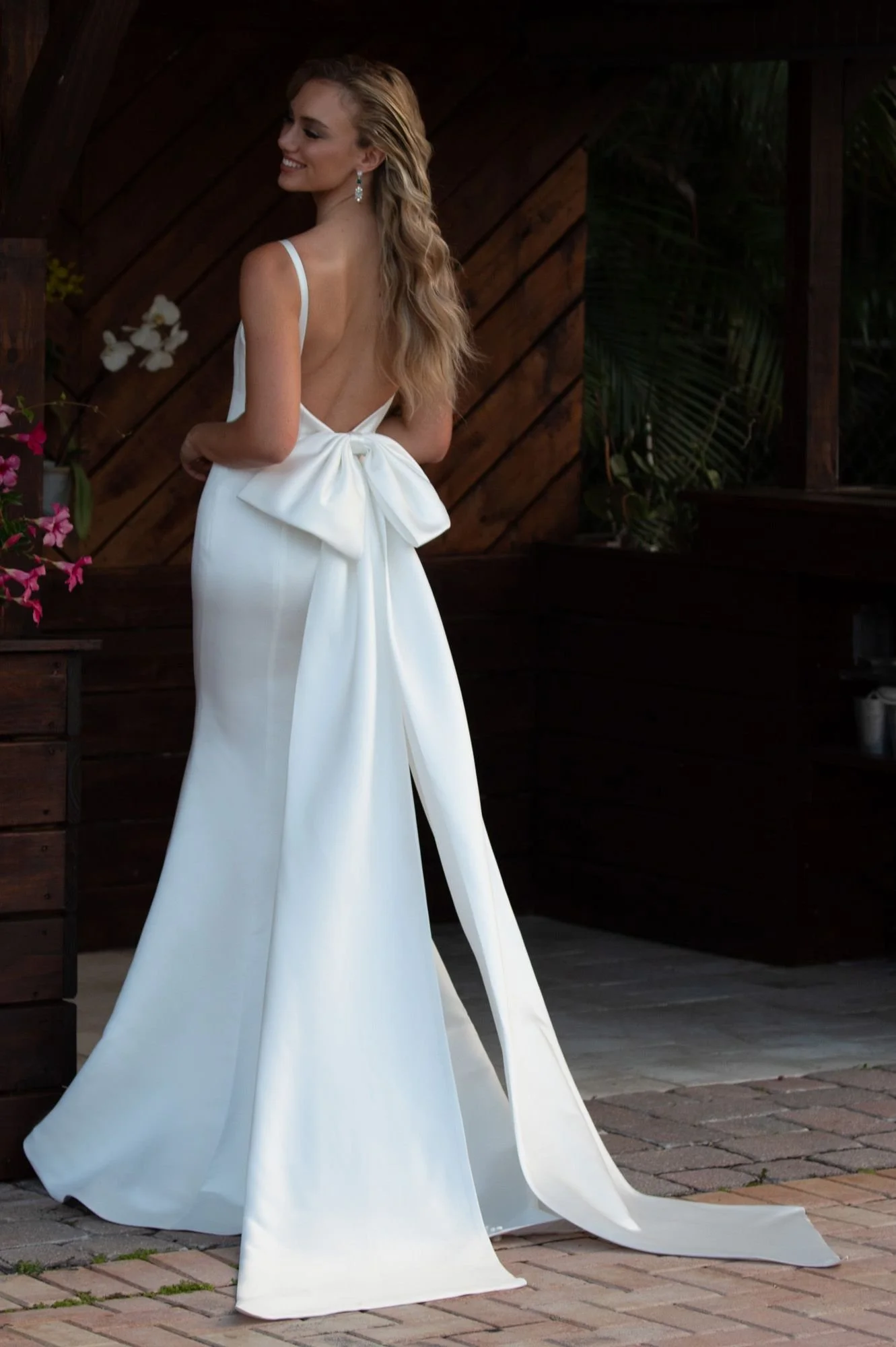Violet Square neckline Duchess Satin modified mermaid gown with low back and removable bow. This beauty is finished with Satin covered buttons to the end of the train. Sign up View fullsize View fullsize View fullsize View fullsize